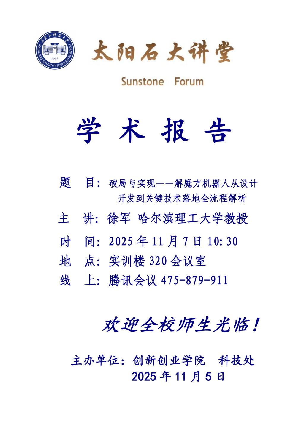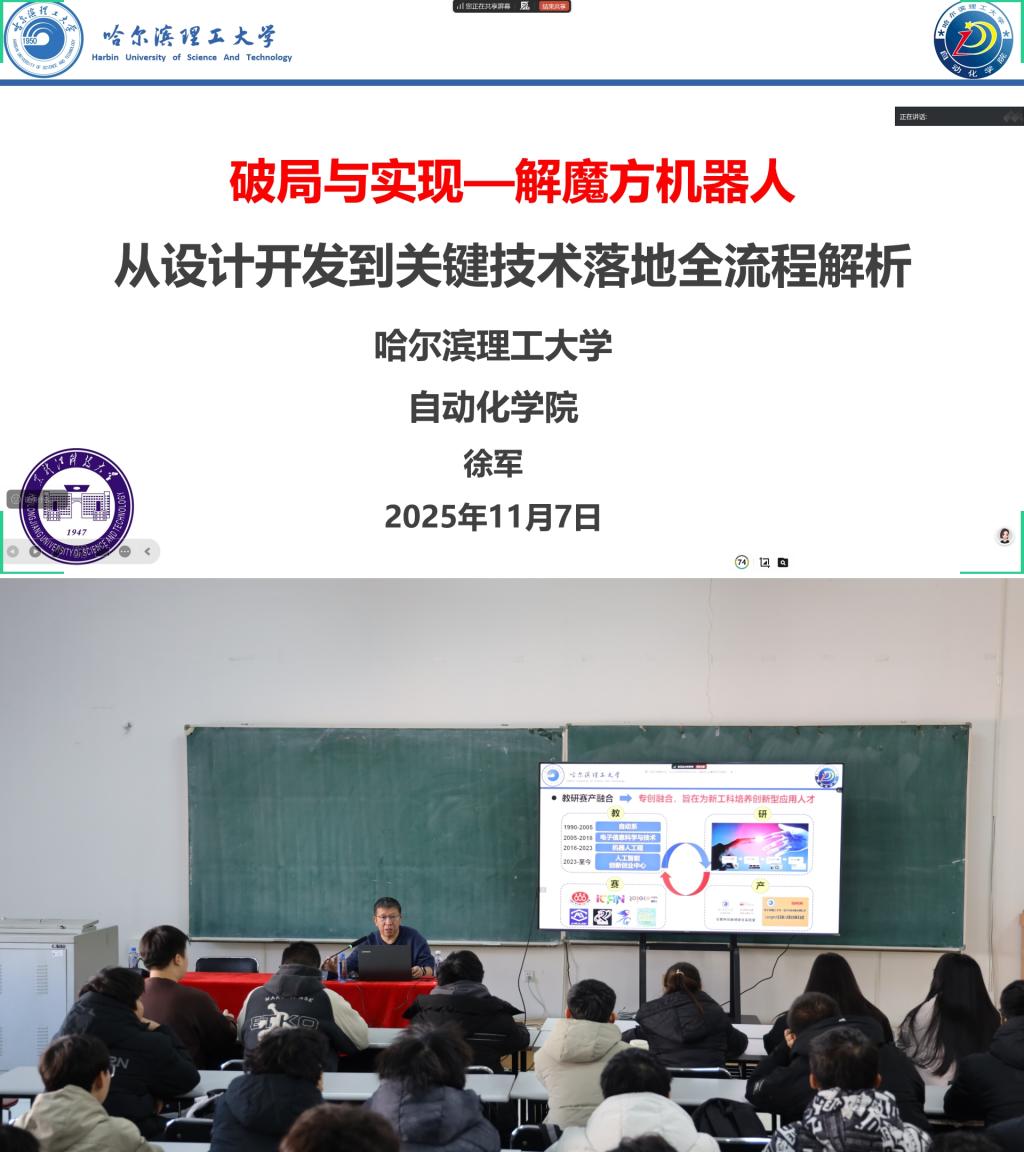 为丰富校园学术文化氛围,深化人工智能与机器人领域学术交流,11月7日,哈尔滨理工大学徐军教授应邀到校作了题为《破局与实现—解魔方机器人从设计开发到关键技术落地全流程解析》的学术报告,相关院系200余名师生参加了报告会,报告会由创新创业学院副院长韩大伟主持。徐军教授长期深耕人工智能应用技术、机器人技术与传感技术领域,尤其在机器人技术落地应用方面有着深厚积累,是兼具理论深度与实践经验的行业专家。报告中,徐军教授从解魔方机器人的灵感来源出发,系统解析了硬件结构、软件平台、控制系统的核...