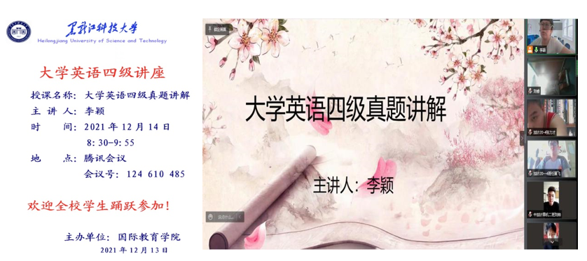 17/ 2021-12国教学院师生云端相聚 助力学生四六级考试12月18日将举行全国大学英语四六级考试,学生们在紧张的复习期间难免会遇到各种问题,为解学生之所急,更好地帮助学生顺利通过考试,体现一切为了学生,为了学生一切的教育理念,使学生因为教师的服务获得更大程度的发展,国际教育学院英语教研室选派李颖老师于12月14日利用腾讯会议面向全校进行了一次四级真题讲解。在讲座中,李颖老师在讲解方法技巧的同时,还帮助同学们树立攻克英语四级的信心。在考前不用过分紧张,放松心...