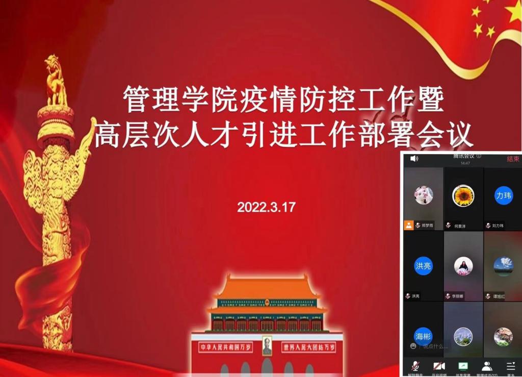 18/ 2022-03【同心战“疫”】管理学院召开疫情防控工作暨高层次人才引进工作部署会议为深入贯彻落实好学校疫情防控工作和2022年高层次人才引进工作部署会议精神,3月17日,管理学院利用腾讯会议平台召开了疫情防控工作暨高层次人才引进工作部署会议。会议由学院党委书记何景洋主持,学院党政班子成员、各系(办、中心)主要负责人及各党支部书记、委员参加了会议。会上,何景洋传达学习了近期学校召开的疫情防控工作和高层次人才引进工作部署会议精神,对下一阶段疫情防控工作进行安排;重点围绕学校制定的《黑龙...