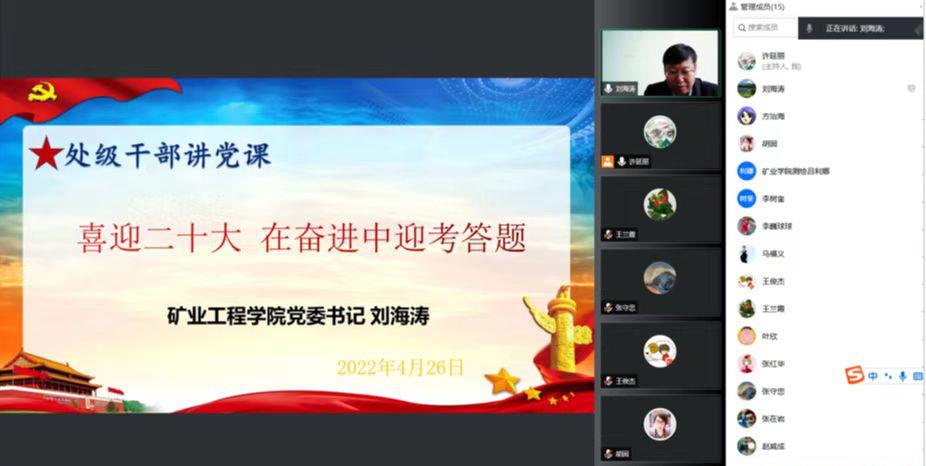 27/ 2022-04矿业工程学院推进处级干部讲党课工作为深入贯彻落实学校第二次党代会精神,推进学校党政工作要点部署的中心工作,结合当前疫情防控形势,4月18日-26日,矿业工程学院组织全体处级干部精心准备,为师生党员线上讲授了一堂堂生动的主题教育专题党课。学院党委书记刘海涛以“喜迎二十大,在奋进中迎考答题”为题,为测地教师党支部讲专题党课。他提出,当好新时代的答卷人,是践行党的初心使命所系,是巩固党的执政地位所在,是实现党的奋斗目标所需。要赓续伟大建党...