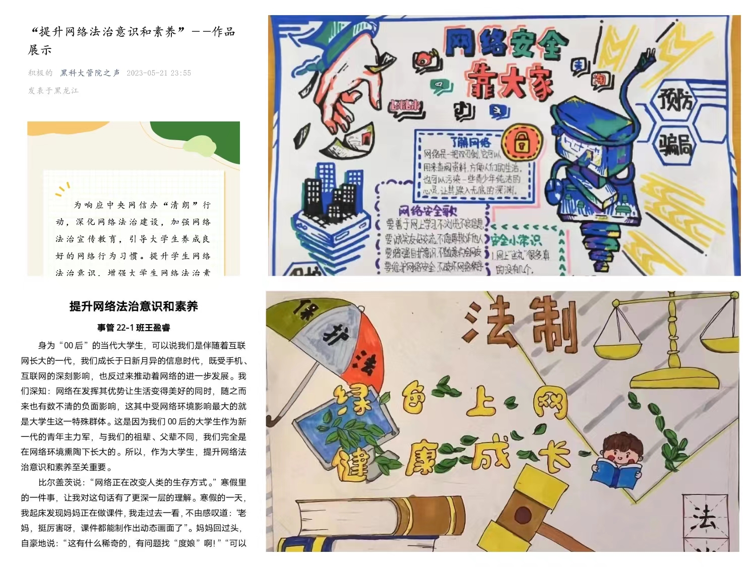25/ 2023-05人文学院开展“提升网络法治意识,增强网络法治素养”系列活动为落实学生工作部下发的《关于在全校学生中开展“提升网络法治意识和素养”专题思想教育活动的实施方案》,加强网络法治宣传教育,增强学生的网络法治意识,引导大学生养成良好的网络行为习惯,进一步弘扬时代新风、共建网络文明,人文学院开展“提升网络法治意识,增强网络法治素养”系列活动。普法脚步不停歇,法治宣传在身边。开展网络法治宣传活动,组织学生学习《中华人民共和国网络安全法》、《新时代的中国网络法治建设...