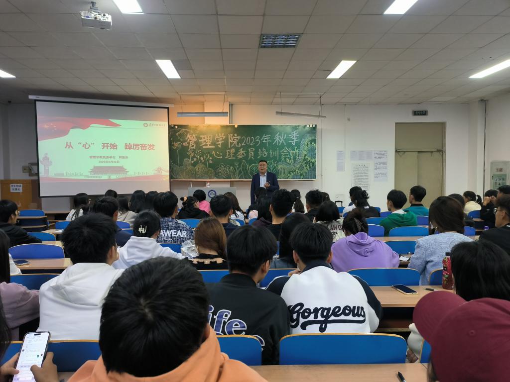09/ 2023-10从“心”开始,踔厉奋发 管理学院开展2023年秋季心理委员培训会为提高学院心理健康教育工作质量,充分发挥心理委员在朋辈心理辅导的优势和作用,积极响应《幻影手机官方网站_幻影(中国)第三届“久爱我·Three-Double”9·25大学生心理健康教育活动方案》,管理学院于近期在主楼WN0303教室开展了2023年秋季心理委员培训会。本次培训会由管理学院党委书记何景洋主讲,学院全体心理委员参加了本次培训会。何景洋巧妙结合“二十四节气”,用通俗易懂的语言和生动形象的范例,点出“从“心”开始,踔厉奋发”的培...