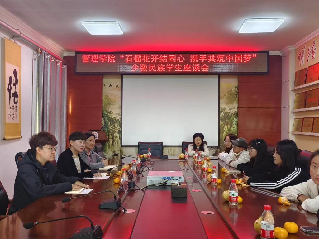 20/ 2023-10石榴花开结同心 携手共筑中国梦——管理学院召开少数民族学生代表座谈会为深入贯彻落实党的二十大精神,全面贯彻中央和省委民族工作会议精神,管理学院结合“不忘初心 砥砺深耕 学思践悟 守正担当“主题思想教育,落实学生处《关于在全校学生中开展“石榴花开结同心 携手共筑中国梦”专题教育活动的实施方案》要求,10月19日,在学院三楼会议室召开“石榴花开结同心 携手共筑中国梦”少数民族座谈会。管理学院党委副书记徐海英、党委委员、副处级辅导员李宁、新生辅导员王筱萌、少数民族代表参加座谈...