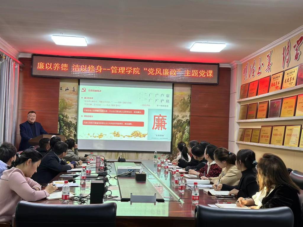 23/ 2023-10管理学院开展党风廉政建设专题党课按照《管理学院2023年全面从严治党暨党风廉政建设宣传月活动实施方案》,为全面学习宣传贯彻党的二十大精神,推进落实新时代廉洁文化建设的意见,以永远在路上的清醒和坚定,深化推进全面从严治党,进一步增强党员干部纪律意识和规矩意识,持续营造风清气正、干事创业的良好政治生态,10月18日,管理学院党委书记何景洋以“廉以养德 洁以修身”为主题,为学院党委领导班子成员、全体党支部书记、教研室主任讲授了一堂主题鲜明、...