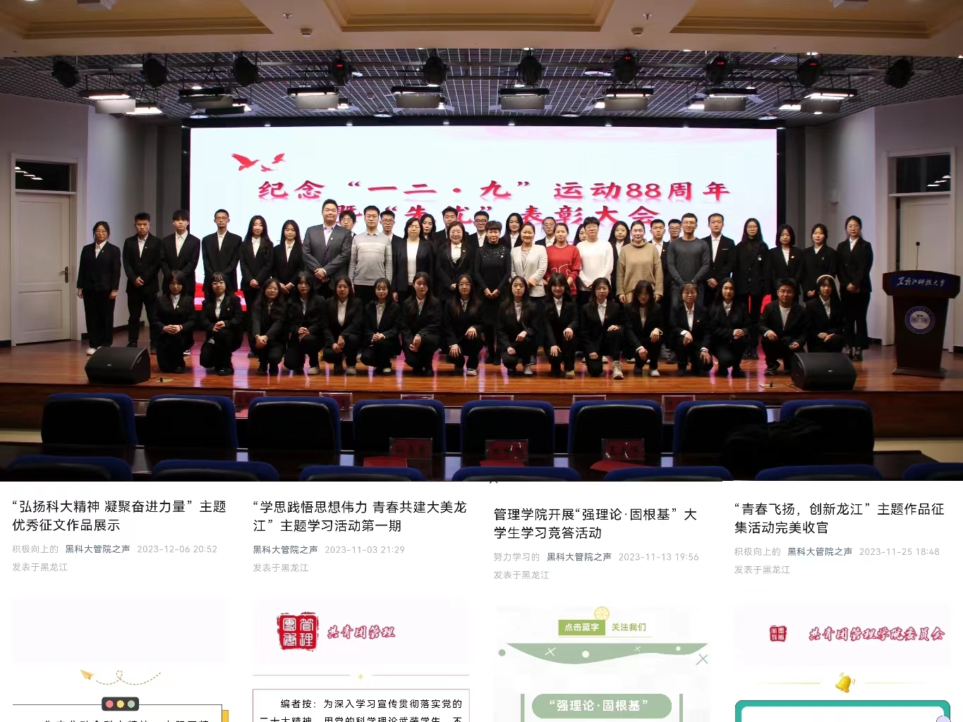19/ 2023-12管理学院成功举办第十二届”江畔高歌“主题文化节为彰显管理学院新一代青年的蓬勃朝气,充分展现当代大学生的精神风貌和人文艺术素养,打造文化育人阵地,发挥第二课堂育人功能,管理学院自10月底开始,历时一个半月,围绕第十二届“江畔高歌”主题文化节,全方位、多角度、深层次、立体化组织开展了丰富多彩的校园文化活动,反响热烈。学思践悟强信念,网络思政开新篇。管理学院聚焦为党育人、为国育才主责主业,扎实开展了“学思践悟思想伟力 青春共建大美龙江”主题学习活动...