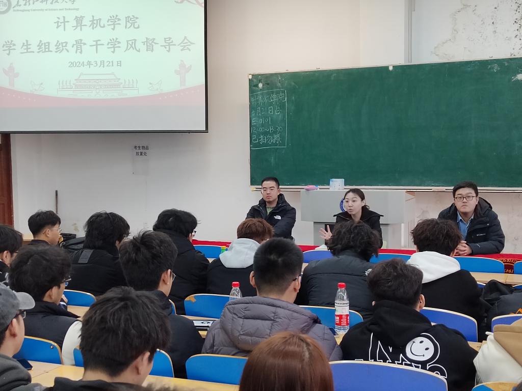 22/ 2024-03计算机学院召开学生组织骨干学风督导会为进一步加强学生组织骨干队伍建设,引导学生骨干筑牢思想意识,端正学习态度,明确学习目标,促进全面发展,按照校团委下发的《学生组织骨干学业预警工作方案》的要求,计算机学院于3月21日中午召开学生组织骨干学风督导会。会议邀请学院科技协会纪检部负责人、2023年黑龙江省三好学生,计科22-1班吕洋进行经验交流。他向大家介绍了自己独特的“七四学习法”,即每天连续学习4小时不断线,前6天主要学习课业知识,第7天研究科...