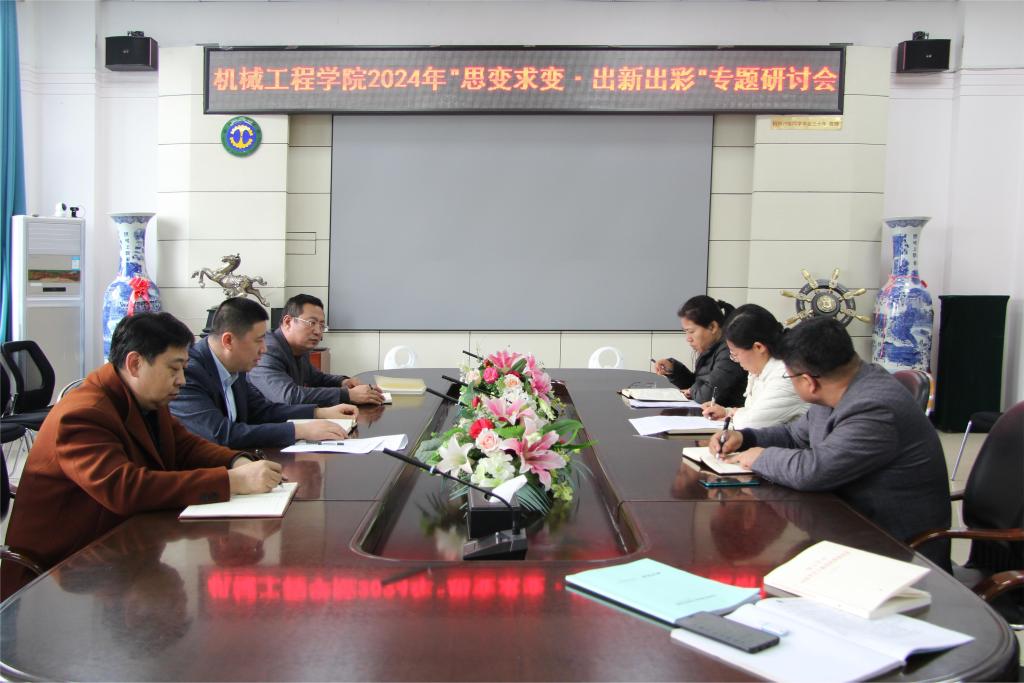 19/ 2024-03机械工程学院召开“思变求变•出新出彩”专题研讨会3月14日下午,机械工程学院在学院二楼会议室召开了“思变求变•出新出彩”专题研讨会。会议旨在督促班子成员进一步谋划设计工作、思考研究工作、推陈出新工作,推动学院各项工作特色突出、亮点频现、提质增效、再上新台阶。领导班子成员全体参加了会议。会议由学院党委书记吕刚主持。会上,党委书记吕刚,院长唐庆菊,副院长齐立涛、张丹,副处级辅导员毕强,分别结合分管工作交流了相关思考和具体设想。会议指出,要清醒认识变...