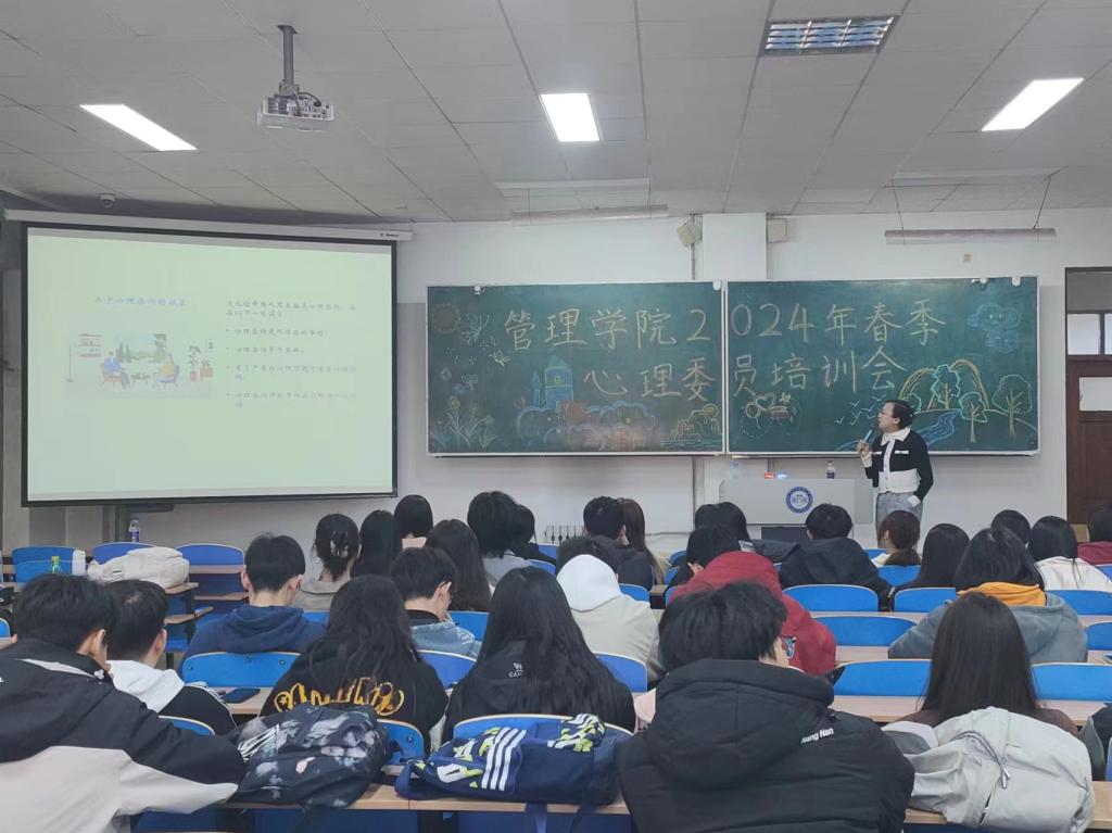 10/ 2024-04管理学院开展2024年春季心理委员培训会为提升管理学院心理健康工作水平,充分发挥心理委员在朋辈工作中的先锋导向作用,按照学校《“永葆赤心、立德践行、勤学善思、笃行担当”主题教育活动方案》和《幻影手机官方网站_幻影(中国)“3·25善爱我-5·25我爱我”大学生心理健康教育宣传月活动指导方案》的要求,管理学院于4月8日在主楼WN0205教室开展了2024年春季心理委员培训会。本次培训会由大学生心理健康中心马宁老师主讲,学院全体心理委员参加本次培训。马宁老师以常见心理问题名...
