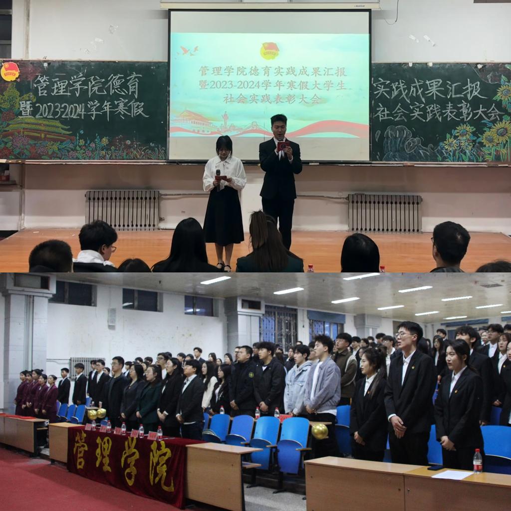 17/ 2024-04管理学院召开德育实践成果汇报暨2023-2024学年寒假社会实践表彰大会为进一步总结寒假社会实践丰硕成果,激励我院青年学生积极投身志愿服务事业,引导和帮助青年学生在实践中“受教育、长才干、作贡献”。近日,管理学院在主楼WN0401召开德育实践成果汇报暨2023-2024学年寒假社会实践表彰大会,管理学院全体辅导员及学生代表100余人参加了本次大会。大会在“光荣啊,中国共青团”的歌声中拉开帷幕,与会人员共同观看了寒假社会实践视频集锦,回顾了寒假社会实践的精彩瞬间。会上,管理学院团委书记...