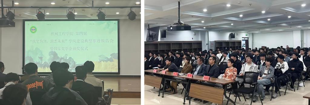18/ 2024-04机械学院举办第四届“执笔为剑•洞悉未来”学风建设典型事迹报告会暨国家奖学金颁奖仪式为进一步加强学风建设,引导学生明确学习目标,端正学习态度,激发学习动力,4月16日晚上,机械工程学院在朝阳楼0239举办第四届“执笔为剑·洞悉未来”学风建设典型事迹报告会暨国家奖学金颁奖仪式。机械工程学院副处级辅导员毕强、各年级辅导员及2022级、2023级学生代表参加了本次活动。会上,国家奖学金获得者机械20-4班程训聪、高质量就业代表机工20-2班王佳宁、退伍大学生代表机工20-3班刘荣富、多项科技创新大赛获奖学生机...