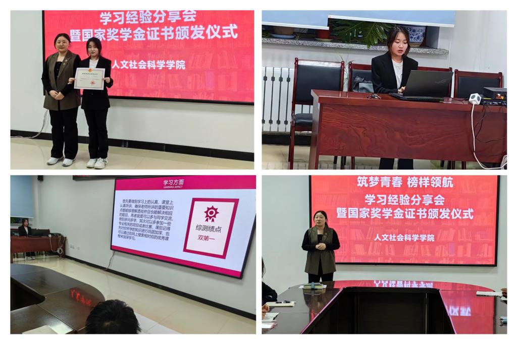 19/ 2024-04人文学院召开“筑梦青春 榜样领航”学习经验分享会暨国家奖学金证书颁发仪式为深入贯彻落实幻影手机官方网站_幻影(中国)“永葆赤心 立德践行 勤学善思 笃行担当”主题思想教育相关要求,充分发挥榜样示范引领作用,营造积极向上的学习氛围,人文学院于4月18日在朝阳楼0317室召开了“筑梦青春 榜样领航”学习经验分享会暨国家奖学金证书颁发仪式。会上,辅导员巩冬阳为国家奖学金获得者社会工作22-1班张恩熙颁发国家奖学金证书,并对其在学习态度、党团活动、学科竞赛、社会实践等方面取得的成绩表示肯定,勉励她在未来的学习和工...