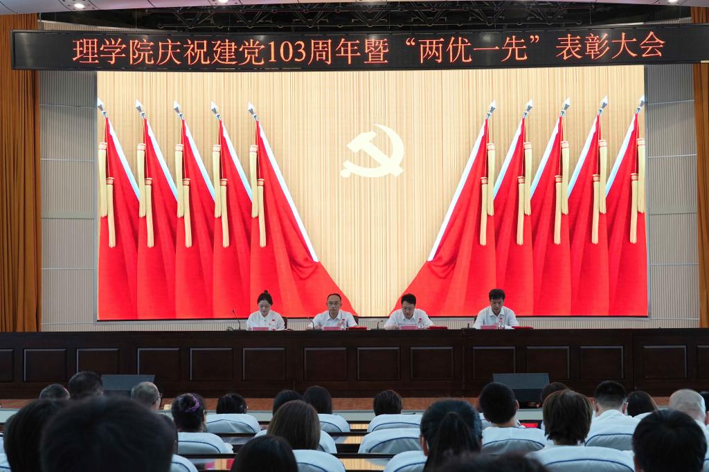 27/ 2024-06理学院召开庆祝建党103周年暨“两优一先”表彰大会为庆祝中国共产党成立103周年,进一步发挥基层党组织战斗堡垒作用和党员先锋模范作用,6月26日下午,理学院在办公楼报告厅召开庆祝建党103周年暨“两优一先”表彰大会。学院领导班子成员、全体师生党员参加会议。会议由学院党委副书记刘星彤主持。会上,院长张向华宣读学院党委《关于表彰优秀共产党员、优秀党务工作者和先进党支部的决定》,希望受到表彰的优秀个人和先进集体,能够珍惜荣誉,再接再厉,继续发挥先锋模范作用,...
