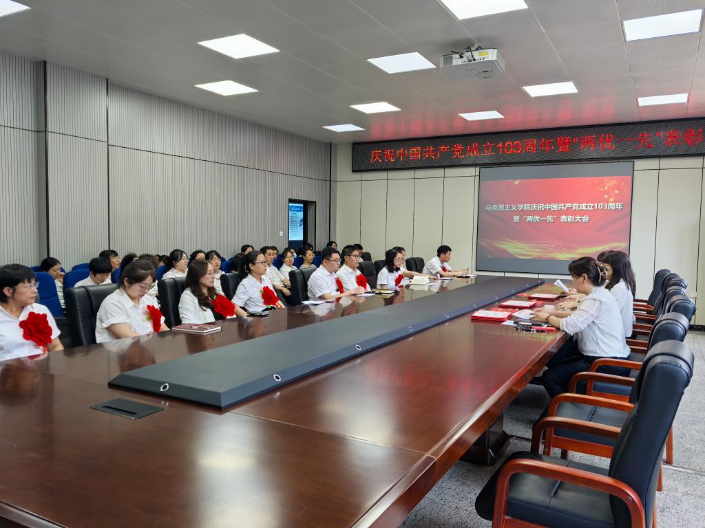 02/ 2024-07马克思主义学院召开庆祝中国共产党成立103周年暨“两优一先”表彰大会在庆祝中国共产党成立103周年之际,为表彰先进,交流经验,发挥基层党组织战斗堡垒作用和党员先锋模范作用,推动学院各项事业再上新台阶。6月28日下午,马克思主义学院召开庆祝中国共产党成立103周年暨“两优一先”表彰大会。学院领导班子成员和全体教师党员参加了大会。大会由副处级辅导员赵红主持。会议在庄严的国歌声中拉开序幕。会上,副院长刘艳君宣读了学院党委《关于表彰优秀共产党员、优秀党务工作者和先进党支部的决定...