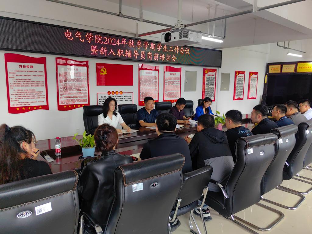 21/ 2024-08电气学院召开秋季学生工作会暨新辅导员培训会为明确新学期学生工作重点,助力新入职辅导员迅速融入学院学生工作的整体环境,8月19日下午,电气与控制工程学院在朝阳楼0607会议室组织召开2024年秋季学期学生工作会议暨新入职辅导员岗前培训会。会议由学院党委副书记侯树成主持,学院全体辅导员参加会议。会上,副处级辅导员韩大伟结合学院的学生工作整体架构,宣读了辅导员工作最新分工,对辅导员工作职责做了进一步明确,并传达了学校学工委会议精神;学工办负责人张孟洁对...