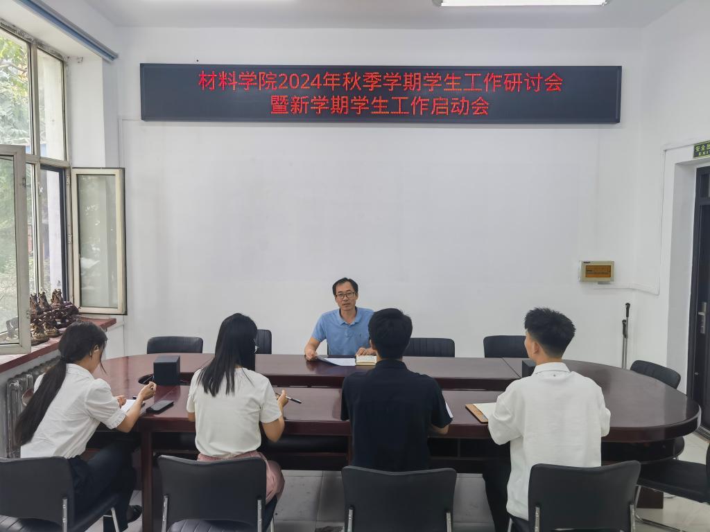 21/ 2024-08材料学院召开2024-2025学年第一学期学生工作研讨会暨新学期学生工作启动会为进一步做好新学期学生工作,8月20日,材料学院召开2024-2025学年第一学期学生工作研讨会暨新学期学生工作启动会。全体辅导员参加会议,会议由学院党委副书记孙亚朋主持。会上,新生辅导员张天翼介绍了2024级新生概况及假期期间迎新准备工作;辅导员王锐针对上学期期末开展的就业动员会征集的毕业生就业意向情况进行汇报;团委负责人王越针对开学前网络家访、特殊学生群体关注、新学期共青团等工作进行传达;学工办负责人王伟...