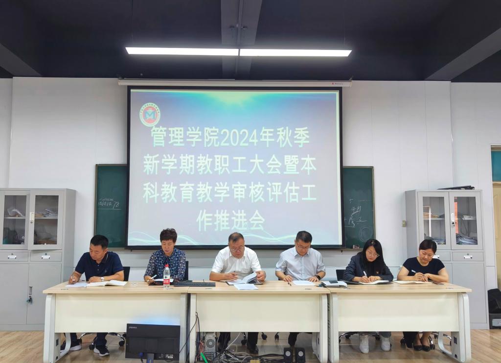 21/ 2024-08管理学院召开2024年秋季新学期教职工大会暨本科教育教学审核评估工作推进会为深入贯彻落实党的二十届三中全会精神,扎实推进学院本科教育教学审核评估及新学期各项工作,奋力开启学院事业高质量发展新征程。8月19日,管理学院召开了2024年秋季新学期教职工大会暨本科教育教学审核评估工作推进会。学院领导班子成员和全体教职工参加会议,会议由学院党委副书记徐海英主持。会上,院长洪亮传达了学校2024年暑期论坛暨秋季学期开学工作会议精神,并围绕学院年度重点工作任务和秋季学期开学启动工作、本科教...