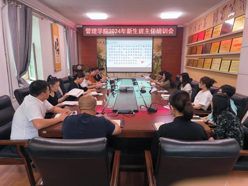 26/ 2024-08管理学院召开2024级新生班主任培训会暨班主任经验交流会班主任是高校学生管理队伍的重要组成部分,是大学生健康成长的指导者和引路人,对学生的思想道德建设和学业生涯发展起着至关重要的作用。为确保2024级新生入学工作的顺利进行,管理学院从队伍选聘、制度建设、交流学习、分析研判等方面着手,切实强化班主任队伍建设,于8月22日召开新生班主任培训会暨班主任经验交流会。学院党委书记何景洋,全体辅导员及2024级新生班主任参加了会议,会议由学院党委副书记徐海英主持。会上,副...