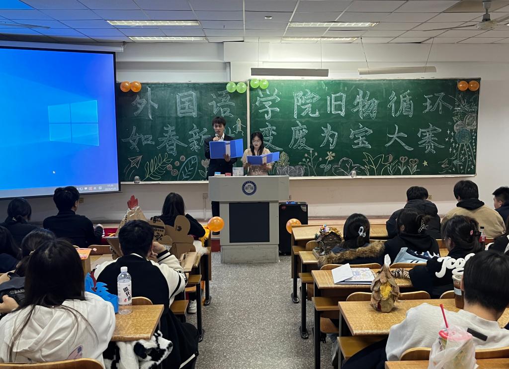 05/ 2024-11外国语学院举办“旧物循环,如春新生”变废为宝创新大赛为深入学习贯彻习近平总书记给中国国际大学生创新大赛参赛学生代表回信的重要精神,引导学生弘扬科学精神,积极投身科技创新,营造良好创新创业氛围,外国语学院组织青年学子赶“变废为宝”之新潮流,于11月2日举办“旧物循环,如春新生”为主题的变废为宝创新大赛。创新大赛分为小组赛前准备和线下讲演两环节。选手携带作品实物参赛,组内派出代表通过PPT、短视频等形式进行作品展示,最后由学生组织主席团成员共同评选。本次...