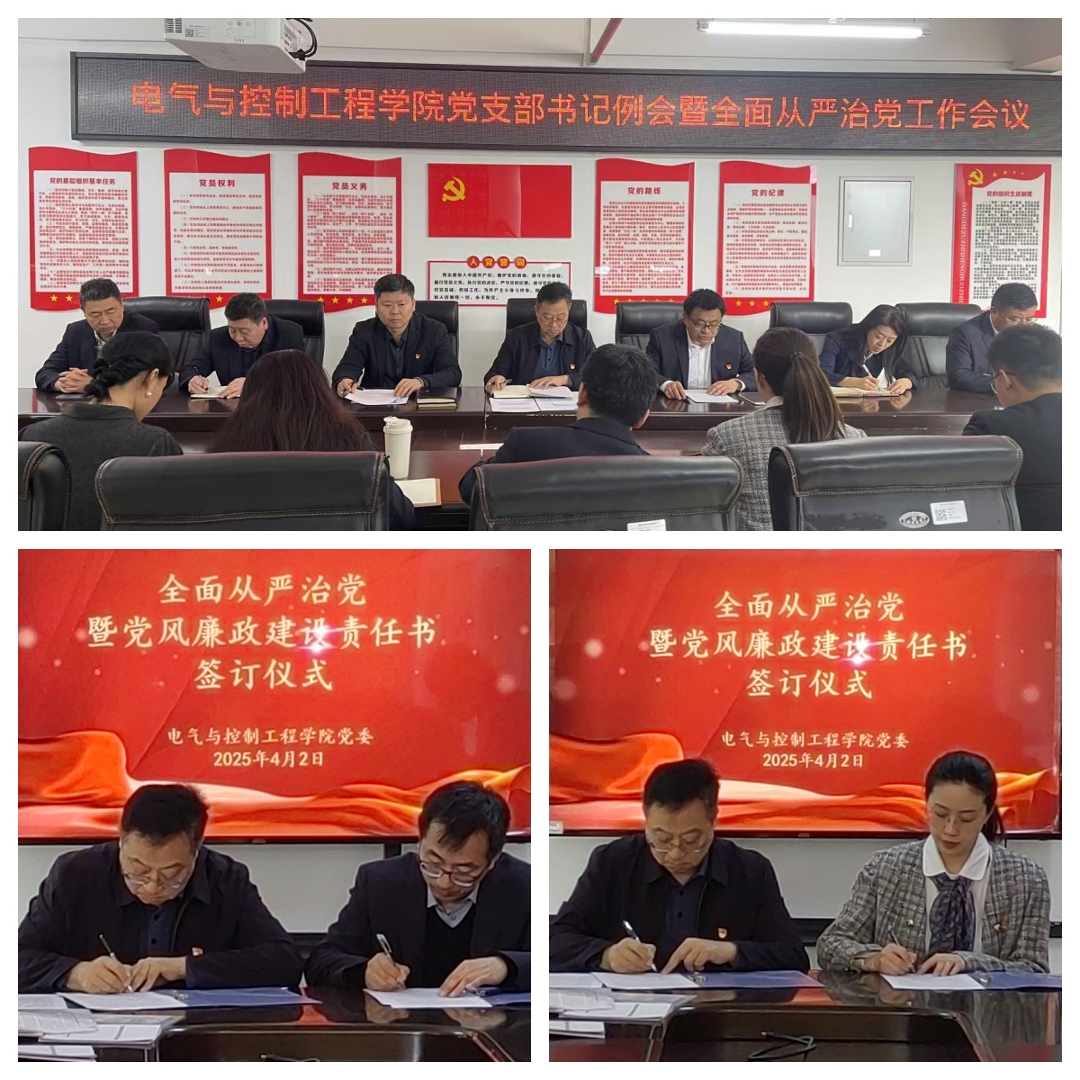 03/ 2025-04电气与控制工程学院召开党支部书记例会暨全面从严治党工作会议4月2日,电气与控制工程学院党委在朝阳楼0607召开了党支部书记例会暨全面从严治党工作会议。会议由党委副书记兼纪委书记侯树成主持,学院党委委员、党支部书记、支部委员、组织员参加了会议。会上,院长苏勋文传达了学校2025年全面从严治党工作会议精神,侯树成对学校《深化干部能力作风建设2025年实施方案》及《关于在全校开展深入贯彻中央八项规定精神学习教育实施方案》进行解读说明,组织员李玉英进行了党支部书记业务工作...