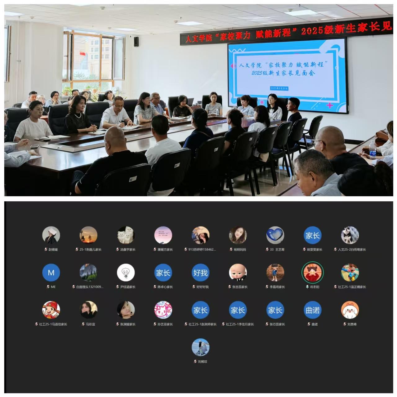 30/ 2025-08人文学院召开“家校聚力 赋能新程”2025级新生家长见面会为深化家校协同,赋能新生成长,8月29日下午,人文学院于朝阳楼0317会议室召开“家校聚力赋能新程”2025级新生家长见面会。学院领导班子成员、各教研室主任、各年级辅导员、新生班主任出席见面会,102位家长通过“线上+线下”融合模式参与。见面会由党委副书记杨凤娟主持。会上,党委书记孙晓辉代表学院致欢迎辞,详细介绍学校发展历程、办学特色、人才培养、招生就业、校友成就、学校精神及近年取得的标志性成果。他强调,学院将始终恪守“以生为本为生尽责”的初心使命,以更开放的育人姿态构建育人场...