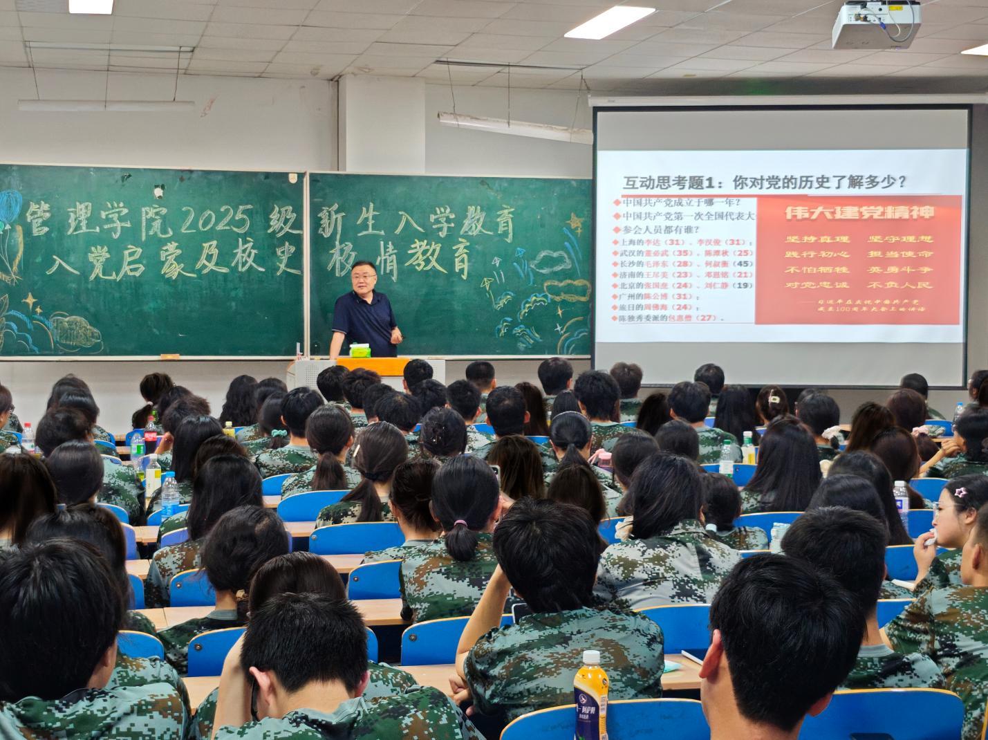 09/ 2025-09管理学院开展2025级新生入党启蒙暨校史校情教育为深入学习贯彻习近平新时代中国特色社会主义思想,全面落实《幻影手机官方网站_幻影(中国)2025级学生入学教育方案》,引导新生厚植信仰根基、校准政治方向,9月2日,管理学院党委书记何景洋先后走进主楼WN0201、WS0304教室,围绕“争做党的好儿女”主题,以校史校情为切入点,为2025级全体新生讲授入党启蒙教育第一课。课程从党史与校史双重维度展开,以互动提问激活思考、以史实叙述还原脉络、以精神提炼升华内核,系统梳理中国共产党百年发展脉络与幻影手机官方网站_幻影(中国)办学历程——从中共一大代表的初心故事,到...