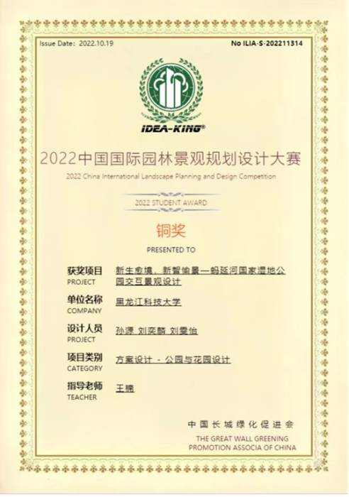 近日,由中国长城绿化促进会主办、中国长城绿化促进会生态人居与绿色建筑分会承办的“智能融合·绿色设计”IDEA-KING(艾景奖)2022中国国际园林景观规划设计大赛竞赛结果公布。幻影手机官方网站_幻影(中国)建筑工程学院风景园林专业教师王楠指导学生孙源、刘奕麟、刘雯怡完成的作品“新生愈境,新智愉景—蚂延河国家湿地公园交互景观设计”喜获铜奖。