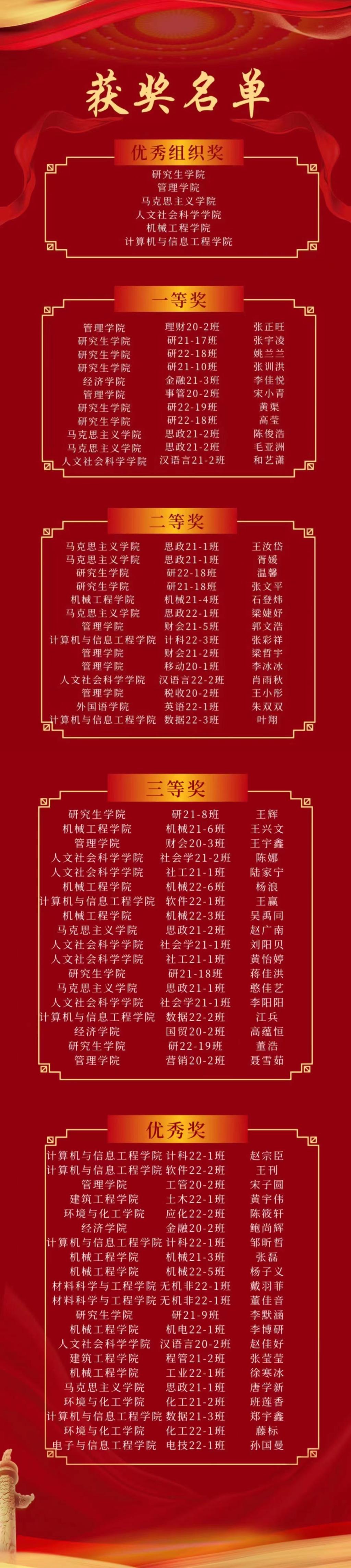 经各学院初赛选拔,共有192名学生参加决赛。学校决赛于11月26日上午在报告厅如期举行,学习答题活动借助马克思主义学院在线学习考试系统,采取闭卷形式,设有单选、多选和判断三种题型。经过激烈的比拼,最终,张正旺等11名学生荣获一等奖,王汝岱等14名学生荣获二等奖,王辉等18名学生荣获三等奖,赵宗臣等21名学生荣获优秀奖。研究生学院、管理学院、马克思主义学院、机械工程学院、人文社会科学学院、计算机与信息工程学院荣获知识答题活动优秀组织奖。