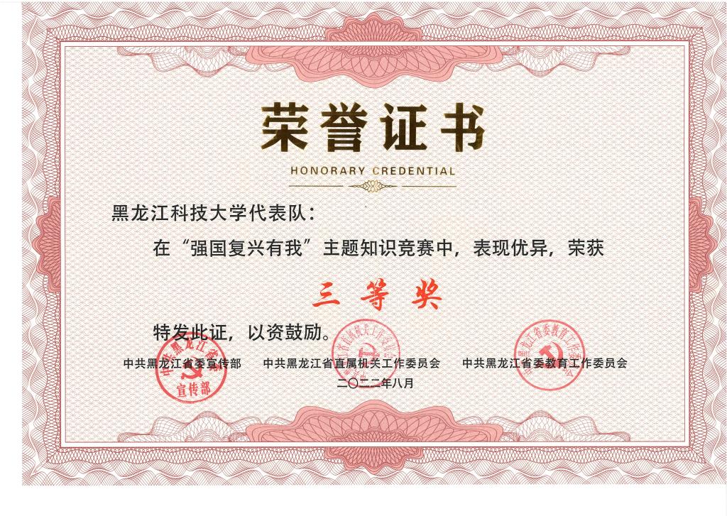 由省委教育工委主办,省高校网络思想政治工作中心承办的全省高校“强国复兴有我”主题知识竞赛活动圆满结束,幻影手机官方网站_幻影(中国)由安全工程学院薛广鑫老师带队、研究生学院土木工程专业2020级14班李培、安全工程学院安全工程专业2019级5班赵晶荣、安全工程学院应急技术与管理专业2021级2班齐明旭三名同学组成的代表队,在全省52支代表队的激烈角逐中,荣获全省高校组“三等奖”和“最佳人气团队奖”。