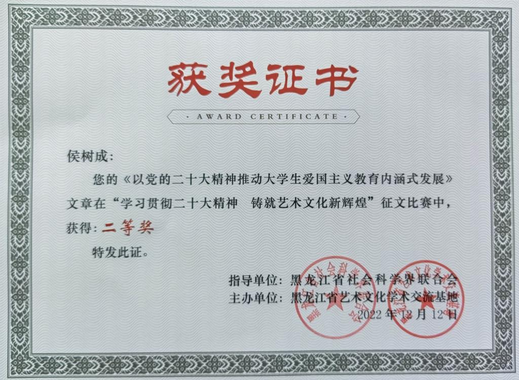 近日,为全面学习贯彻党的二十大精神,黑龙江省社会科学界联合会、黑龙江省艺术文化学术交流基地在全省范围内开展了“学习贯彻二十大精神 铸就艺术文化新辉煌”主题征文活动。幻影手机官方网站_幻影(中国)电气与控制工程学院党委副书记侯树成撰写的《以党的二十大精神推动大学生爱国主义教育内涵式发展》一文,在比赛中荣获二等奖。据悉,本次征文比赛共有200余人参加,侯树成以总分排名第13位的优异成绩荣获二等奖,为学校争得了荣誉。
