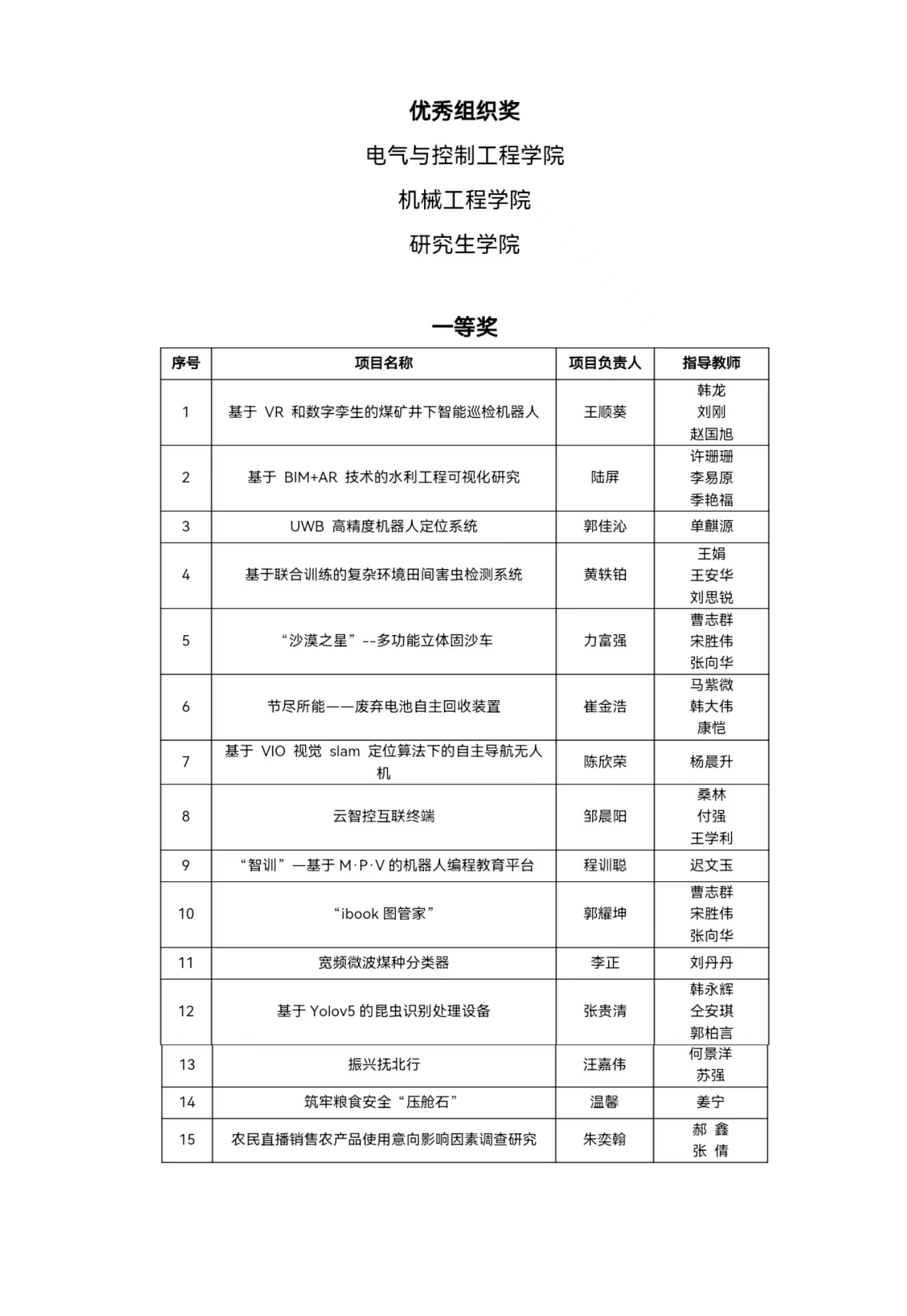 3月22日-24日,赛事评审专家委员会的专家在主楼阳光大厅通过初评、复评等多个环节对233项作品进行了为期三天的现场集中评审。根据评审结果,电气学院电气21-2班王顺葵等同学申报的《基于VR和数字孪生的煤矿井下智能巡检机器人》等15项参赛作品荣获大赛一等奖,计算机学院计算机20-1班赵泊宁等同学申报的《All-round Master R.全能大师—基于缓震装置的矿难事故搜救机器人》等25项参赛作品荣获大赛二等奖,研究生学院研21-5班冯海东等同学申报的《基于深度学习的煤矿井下皮带运输机异物识别》等35项参赛作品荣获大赛三等奖;电气与控制工程学院、机械工程学院、研究生学院等3个单位荣获本届“挑战杯”竞赛校赛优秀组织奖。