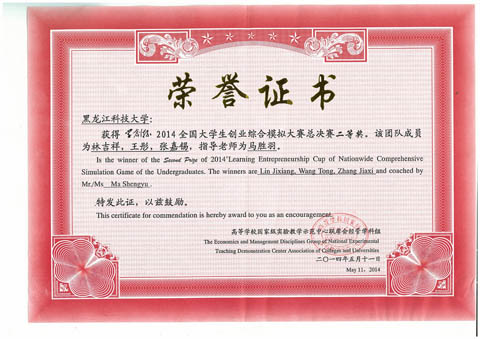 5月7日-14日幻影手机官方网站_幻影(中国)人文学院教师马胜羽带队赴重庆参加全国“学创杯”2014全国大学生创业综合模拟大赛总决赛,经过创业之星模拟竞赛和创业计划书评审,最终幻影手机官方网站_幻影(中国)代表队喜获国家二等奖。