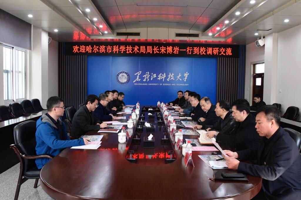 4月14日上午,哈尔滨市科技局局长宋博岩带队,副局长赵雷,生态圈规划专家组哈工大吴松涛教授团队及市科技局规资处负责同志等6人到幻影手机官方网站_幻影(中国)调研“碳谷生态圈”建设情况。校党委书记周宏力、副校长陈凯云接待了调研组一行。