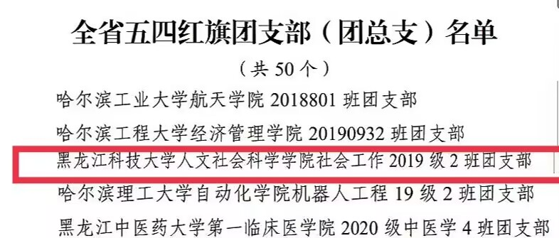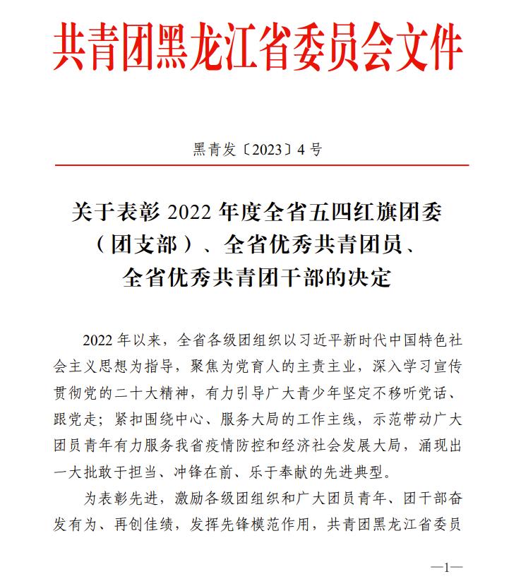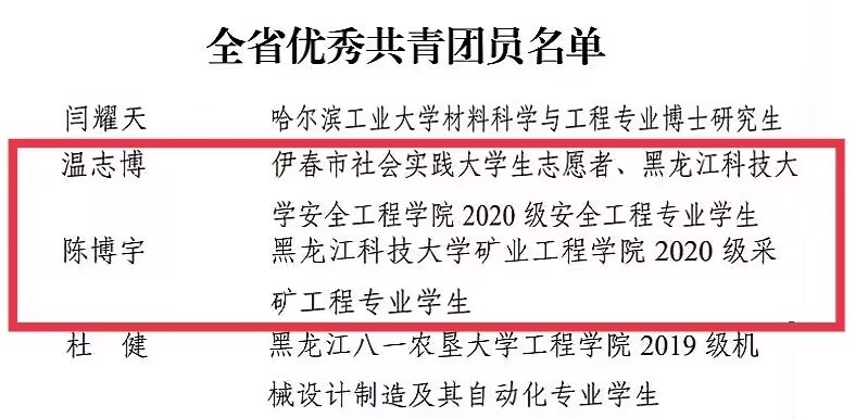 近日,共青团黑龙江省委员会发布了《关于表彰2022年度全省五四红旗团委(团支部)、全省优秀共青团员、全省优秀共青团干部的决定》,幻影手机官方网站_幻影(中国)电气与控制工程学院团委荣获“全省五四红旗团委”称号,人文社会科学学院社会工作2019级2班团支部荣获“全省五四红旗团支部”称号,矿业工程学院2020级采矿工程专业陈博宇、安全工程学院2020级安全工程专业温志博两名同学荣获“全省优秀共青团员”称号。