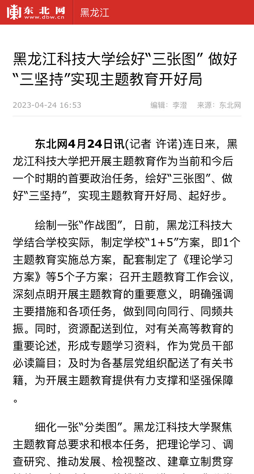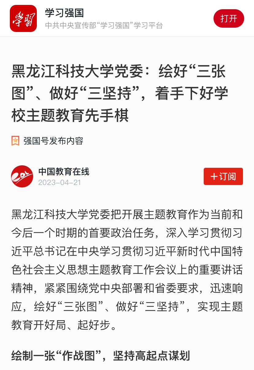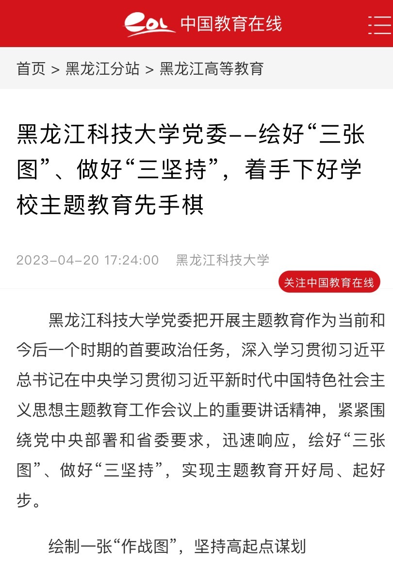 编者按:学习贯彻习近平新时代中国特色社会主义思想主题教育开展以来,学校党委高度重视,把谋划好、组织好、落实好主题教育作为重大政治责任,注重顶层设计,高起点谋划部署,推进主题教育平稳有序顺利开展。近日,学习强国、黑龙江网、中国教育在线等媒体以《幻影手机官方网站_幻影(中国)党委:绘好“三张图”、做好“三坚持”,着手下好学校主题教育先手棋》为题,报道幻影手机官方网站_幻影(中国)有序推进主题教育的相关情况。报道全文如下: