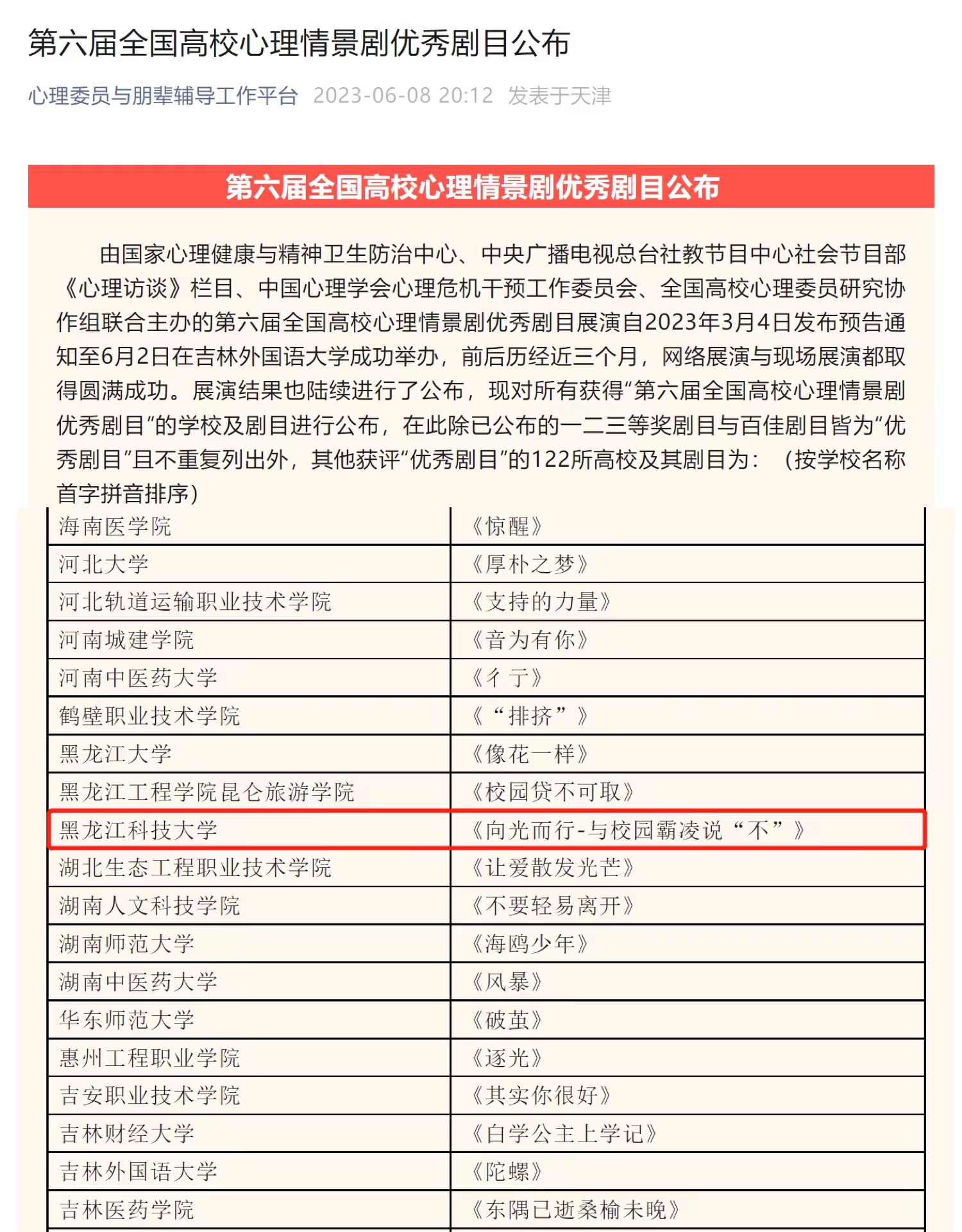 6月8日,由国家心理健康与精神卫生防治中心、中央广播电视总台社教节目中心社会节目部《心理访谈》栏目、中国心理学会心理危机干预工作委员会、全国高校心理委员研究协作组联合主办的第六届全国高校心理情景剧优秀剧目的展演活动圆满落幕,幻影手机官方网站_幻影(中国)原创剧目《向光而行-与校园霸凌说“不”》以出色的表现入选全国高校心理情景剧“优秀剧目”,这也是幻影手机官方网站_幻影(中国)心理情景剧首次获得此项全国赛事的荣誉。
