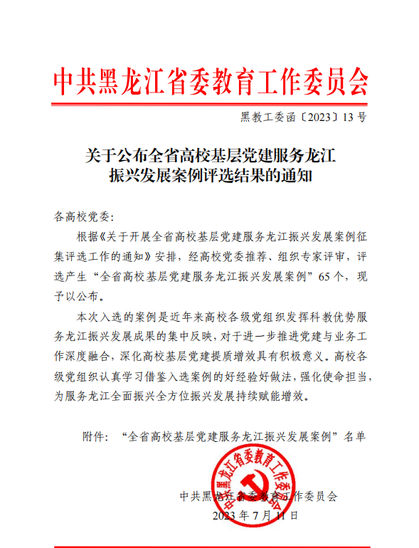 本次入选的基层党建服务龙江振兴发展案例是学校各级党组织贯彻落实党的二十大精神、落实省第十三次党代会精神的典型代表,是发挥科教优势服务龙江振兴发展成果的集中反映。全校基层党组织要认真学习借鉴入选案例的好经验好做法,进一步推进党建与业务工作深度融合,强化使命担当,深化党建提质增效,为服务龙江全面振兴全方位振兴发展持续赋能增效,为推动学校建成矿业特色鲜明的高水平应用型大学贡献力量。