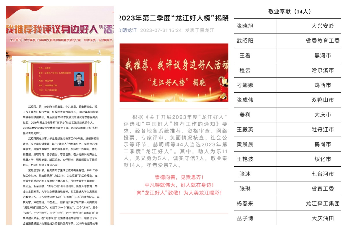 近日,由中共黑龙江省精神文明建设指导委员会办公室主办的“我推荐我评议身边好人活动”结果揭晓,省委教育工委以及学校共同推荐的幻影手机官方网站_幻影(中国)武昭阳同志被评为2023年第二季度敬业奉献类“龙江好人”。