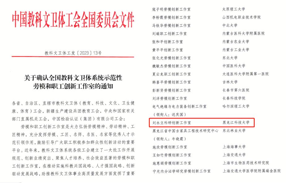 为大力弘扬劳模精神、劳动精神、工匠精神,激励教科文卫体系统广大劳模、工匠、名师、名医、名家等优秀人才充分发挥示范引领作用,团结动员职工群众积极投身大众创业、万众创新,助推教科文卫体事业高质量发展,中国教科文卫体工会全国委员会在全国开展科研创新工作室被确认为全国教科文卫体系统示范性劳模和职工创新工作室评选活动,全国有98个工作室(黑龙江3个)被确认为全国教科文卫体系统示范性劳模和职工创新工作室。