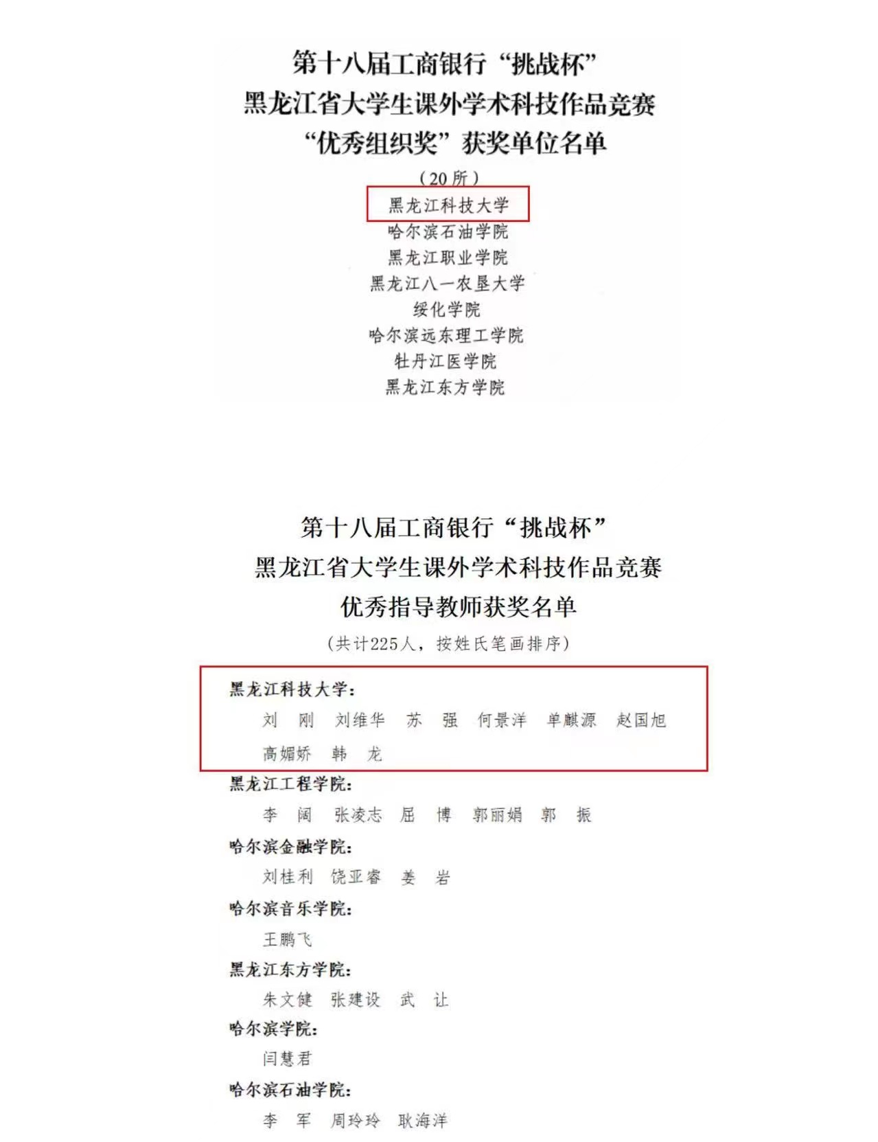 近日,由团省委、省教育厅等部门共同举办的第十八届工商银行“挑战杯”黑龙江省大学生课外学术科技作品竞赛结果揭晓,幻影手机官方网站_幻影(中国)获得一等奖4项、二等奖5项、三等奖10项。幻影手机官方网站_幻影(中国)被授予“优秀组织奖”,8名教师荣获“优秀指导教师”荣誉称号。