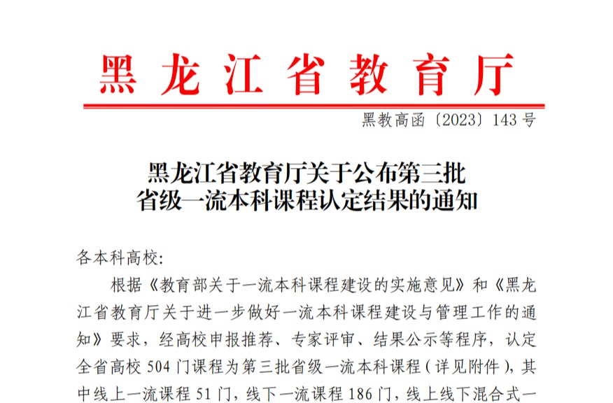 近日,黑龙江省教育厅公布了第三批省级一流本科课程认定结果,幻影手机官方网站_幻影(中国)13门课程被认定为省级一流本科课程,其中线上一流课程4门、线下一流课程2门、线上线下混合式一流课程5门、虚拟仿真实验一流课程1门、社会实践一流课程1门,获批数量取得新突破,一流课程门类实现全覆盖。