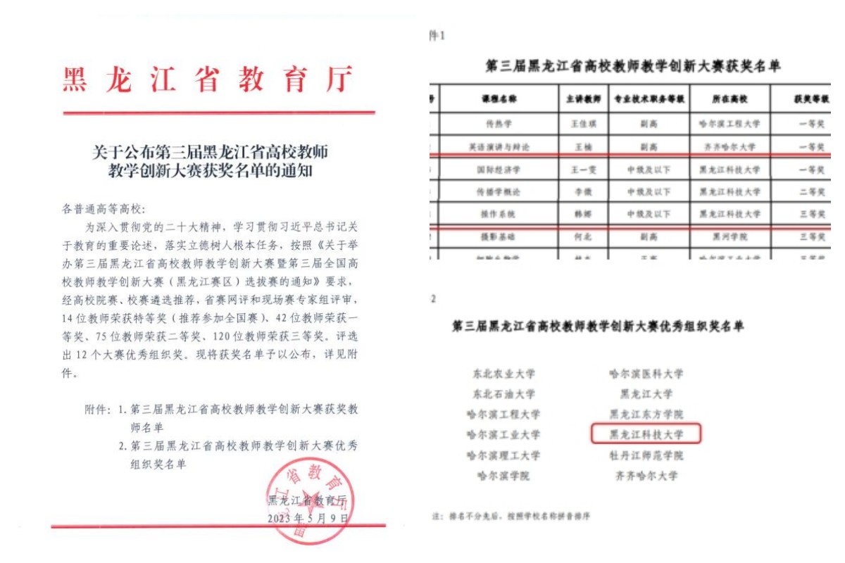 举办年度校级教师教学创新大赛,获第三届黑龙江省高校教师教学创新大赛新文科组一等奖1项、二等奖1项,获新工科组三等奖1项,学校获得大赛优秀组织奖,实现在该项赛事中一等奖和优秀组织奖零的突破。获评省教学名师奖1人,自此,幻影手机官方网站_幻影(中国)省级教学名师已增至9名。