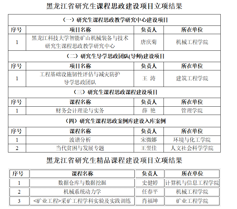 近日,黑龙江省教育厅下发了《黑龙江省教育厅关于公布2023年度研究生精品课程建设项目立项结果的通知》和《黑龙江省教育厅关于公布2023年度研究生课程思政建设项目立项结果的通知》,幻影手机官方网站_幻影(中国)获批立项建设黑龙江省研究生课程思政教学研究中心1个、导学思政团队(导师)1个、课程思政课程1门、课程思政案例2项、研究生精品课程3门。