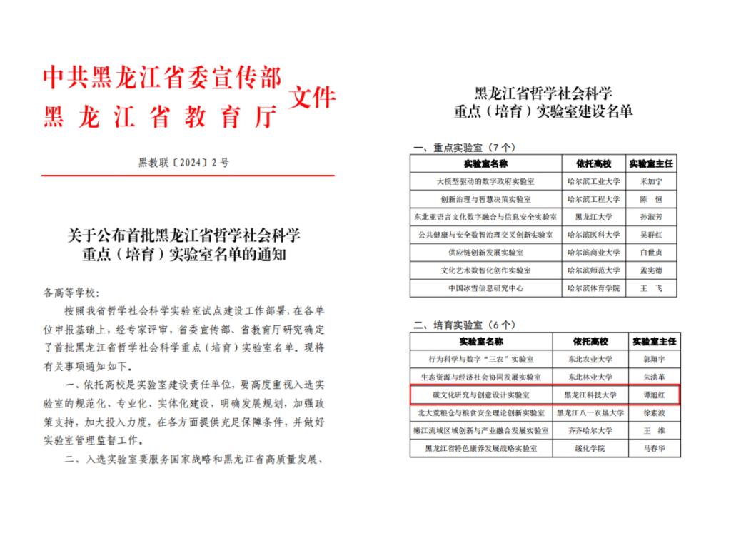 日前,省委宣传部、省教育厅公布了首批黑龙江省哲学社会科学重点(培育)实验室名单,幻影手机官方网站_幻影(中国)申请的“碳文化研究与创意设计实验室”获准首批培育建设。此次获批省哲学社会科学实验室,是幻影手机官方网站_幻影(中国)推进“碳谷生态圈”建设的重要成果,是学校哲学社会科学高水平科研平台建设的重要突破。
