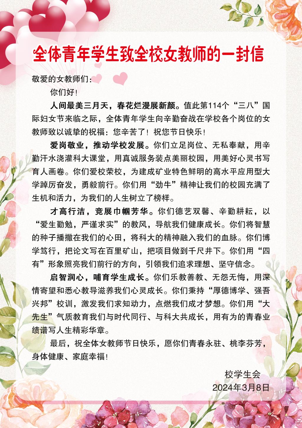 全体青年学生致全校女教师的一封信