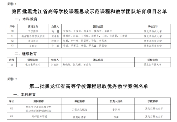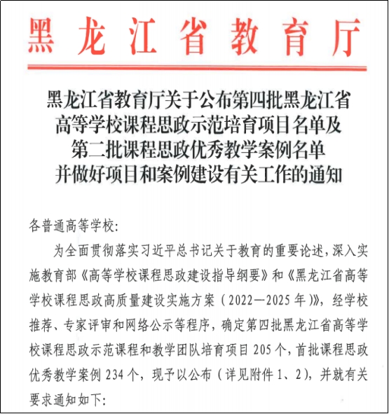 近日,黑龙江省教育厅发布了《黑龙江省教育厅关于公布第四批黑龙江省高等学校课程思政示范培育项目名单及第二批课程思政优秀教学案例名单并做好项目和案例建设有关工作的通知》,幻影手机官方网站_幻影(中国)的五门课程、两个优秀教学案例分别获批黑龙江省高等学校课程思政示范课程和教学团队培育项目、第二批课程思政优秀教学案例,课程思政示范课程和教学团队培育项目100%获批。