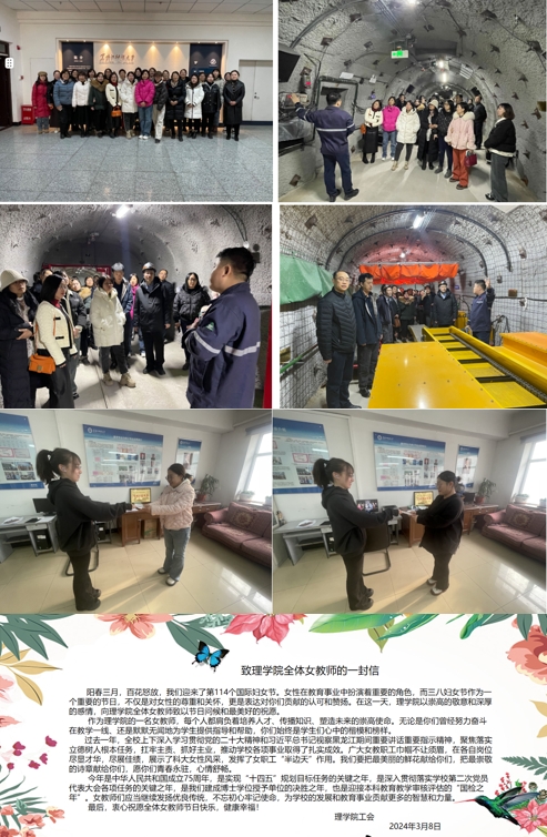 理学院工会开展了纪念“三八”国际妇女节系列活动。学院组织女教职工参观了学校地下模拟矿井,切身感受在保证国家能源安全和“双碳”战略过程中凝结成的“陈郁精神”“太阳石精神”“劲牛精神”等红色精神文化。随后,学院工会组织工会委员为女教职工们送上观影券,让大家在工作之余放松心情,获得更多的幸福感、满足感。同时在工作群里送出“致理学院全体女教师的一封信”,向理学院全体女教职工致以节日的问候和最美好的祝愿。
