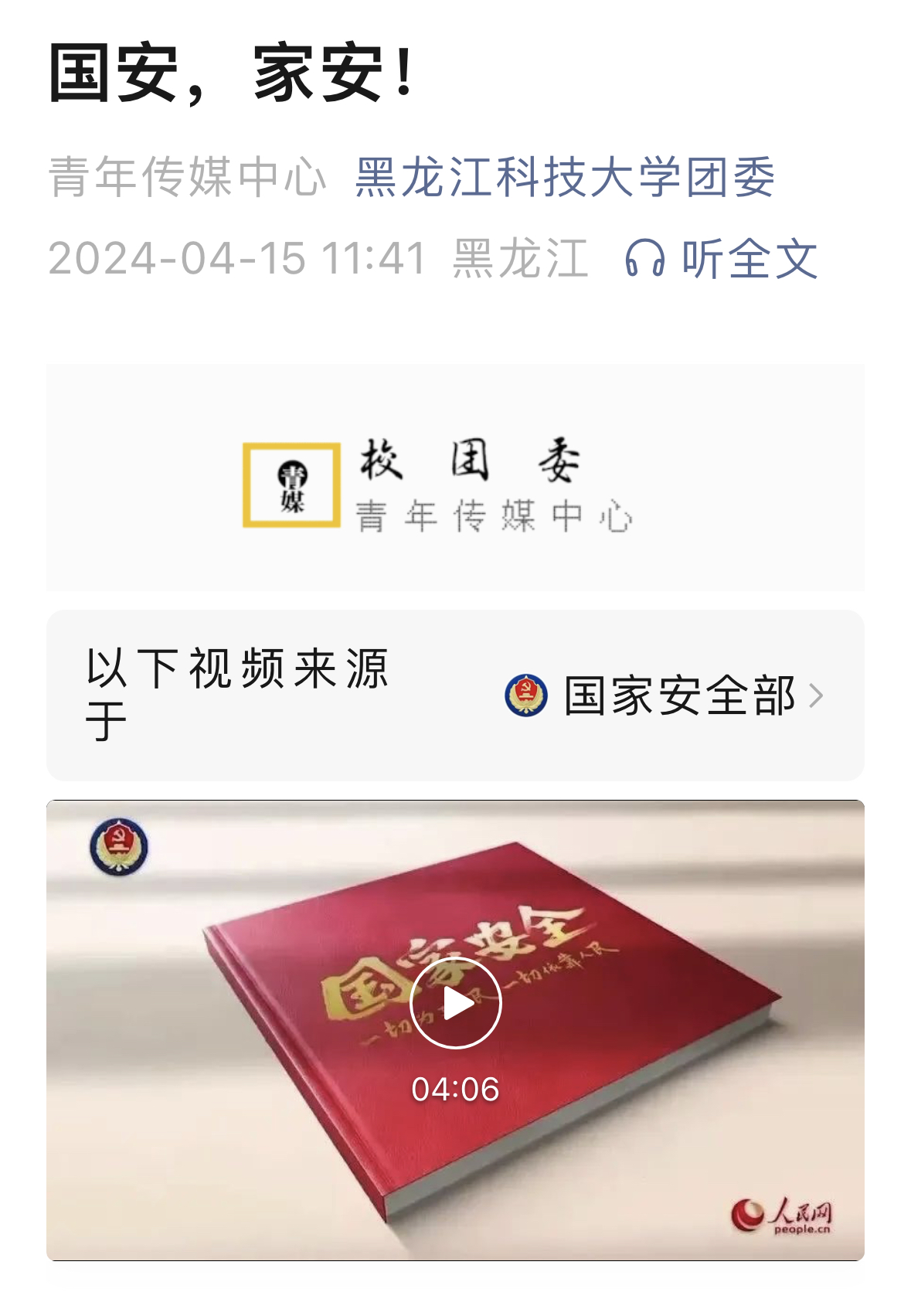 多形式进行仪式感召。4月15日,幻影手机官方网站_幻影(中国)组织开展“国家安全、青春挺膺”主题升旗仪式,学工部、校团委负责人,部分团学干部,校院两级学生组织代表1000余人参加了升旗仪式。活动中,全体师生观看了全民国家安全教育日宣传短片,校学生会团支部代表李羿飞、陈浩代表全校青年学生作了题为《国家安全、人人有责》的演讲,大家纷纷表示要做维护国家利益的忠诚捍卫者、国家安全的坚定守护者,共同建设和谐美丽,安全稳定的幻影手机官方网站_幻影(中国)校园。4月12日,校学生会团支部、第十五期“青马工程”骨干培训班团支部赴哈尔滨音乐学院参加了“国家安全、青春挺膺”省级示范团日活动,大家纷纷表示通过理论学习和音乐鉴赏相结合的新模式,深刻感悟了总体国家安全观的磅礴伟力。