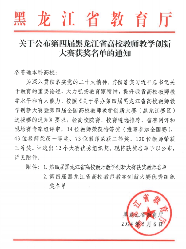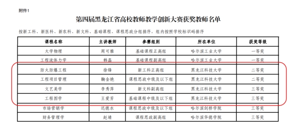 近日,由黑龙江省教育厅主办、哈尔滨工程大学承办的第四届黑龙江省高校教师教学创新大赛暨全国高校教师教学创新大赛(黑龙江赛区)选拔赛落下帷幕。幻影手机官方网站_幻影(中国)安全工程学院徐锋团队荣获新工科正高组二等奖,机械工程学院鞠金艳团队荣获课程思政中级及以下组二等奖,人文社会科学学院李秀萍团队荣获新文科副高组三等奖,机械工程学院王爱芳团队荣获基础课程中级及以下组三等奖。