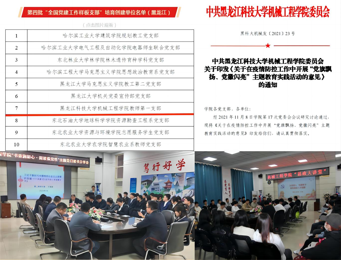 突出党建引领。将师德师风建设作为党建工作的着力点,加强对教师的思想引领和组织带动。一是建强教师支部。充分发挥教师支部在教师队伍管理、教育教学改革、思想政治工作等方面作用,坚持以习近平新时代中国特色社会主义思想凝心铸魂。教师第一党支部入选全国党建工作样板支部培育创建单位;二是发挥模范作用。实施教师党员先锋工程,建立了党员示范岗、设立党员责任区,开展志愿服务、结对帮扶等,还组织举办了“班子成员思政大讲堂”“党员先锋课程思政示范课堂”等;三是严肃组织生活。开展了“学习《习近平谈治国理政》第四卷,寻找最美朗读者”“书香润初心·阅读强党性”和“党旗飘扬、党徽闪亮”“廉洁从政从教·打造清风机械”等主题党日、主题教育活动。