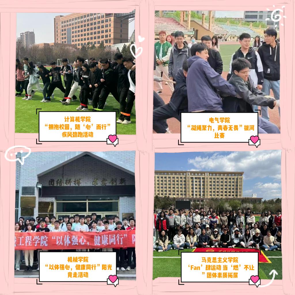 体育是促进学生心理健康的重要动力,环境与化工学院、电气与控制工程学院、材料科学与工程学院、人文社会科学学院及理学院开展心理趣味运动会、计算机与信息工程学院开展“拥抱校园,随‘心’而行”疾风劲跑活动、电气与控制工程学院开展“凝绳聚力,青春无畏”拔河比赛、机械工程学院开展“以体强心,健康同行”阳光竞走、马克思主义学院开展“‘Fan’肆运动 当‘燃’不让”团体素质拓展等一系列普及性、趣味性、竞技性相结合的身心共健体育活动,引导学生在团队协作和竞技比拼中调节情绪、缓解压力,培育积极心态和坚强意志品质。